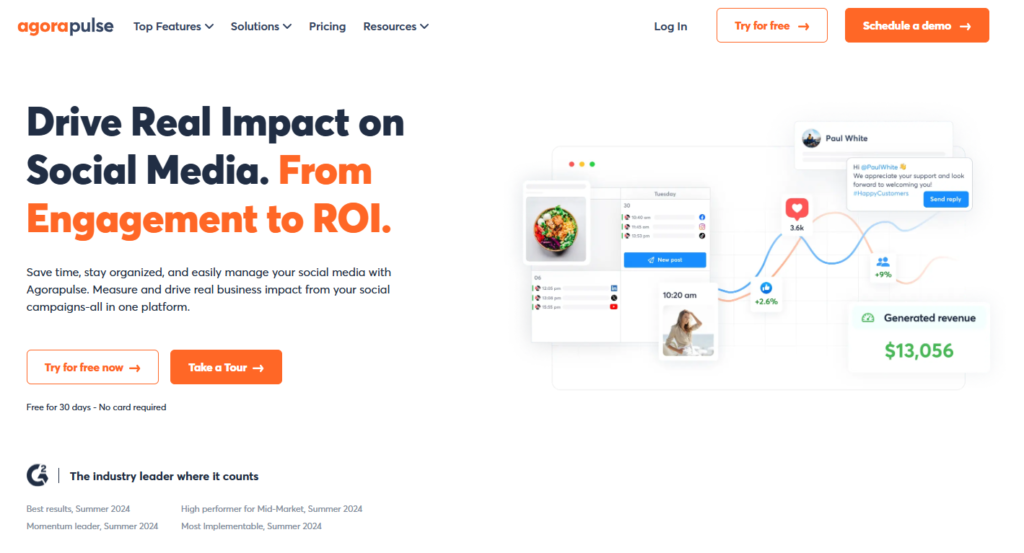 Key StrengthsSmart Inbox aggregating all mentions, messages, and comments across platforms into a single actionable feed, real-time keyword and brand monitoring on Standard and above, AI-powered sentiment analysis (Advanced), competitor analytics dashboard, message spike alerts (Advanced), team task assignment for mentions requiring response, 30-day trial