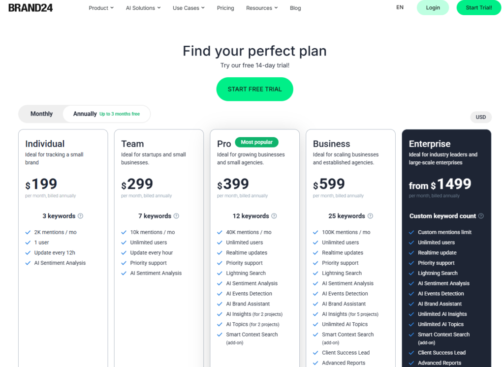 PricingIndividual $249/mo ($199/mo annual, 1 user, 3 keywords, 2K mentions). Team $349/mo ($299/mo annual, unlimited users, 7 keywords, 5K mentions). Pro $499/mo ($399/mo annual, 12 keywords, 25K mentions). Enterprise started from and custom keyword count