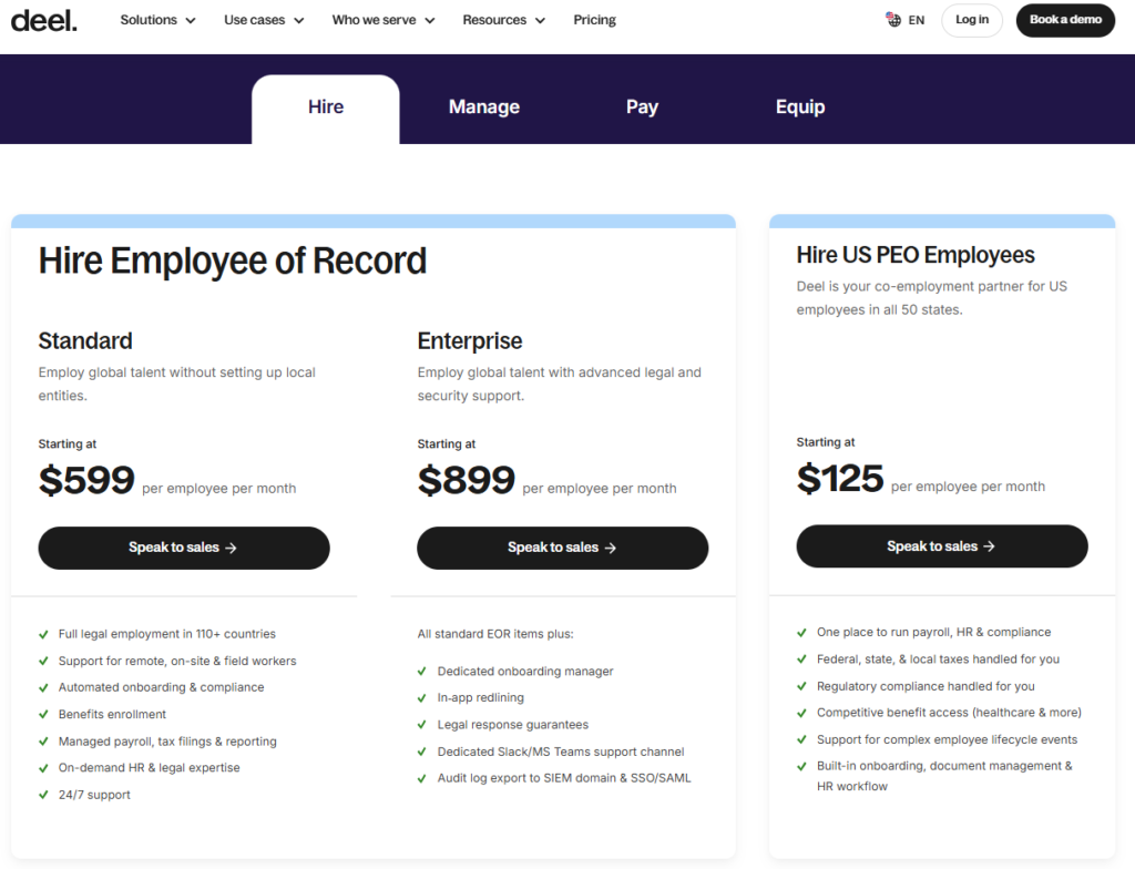 If you are hiring internationally or managing employees in multiple countries: Deel — free HRIS for core HR, EOR from $599/employee/mo for international full-time hires in countries without your own entity, global payroll from $29/employee/mo.