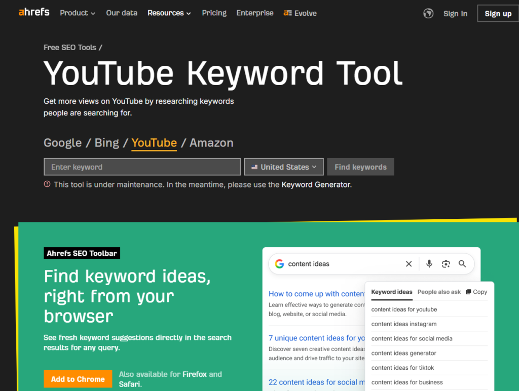 Ahrefs’s inclusion in a YouTube SEO tools list reflects the maturity of its YouTube keyword database rather than any YouTube-specific feature design. The Keywords Explorer in Ahrefs allows users to toggle between search engines — Google, Bing, Amazon, YouTube, and others — and the YouTube database is large and well-maintained enough to support serious YouTube keyword research with the same analytical rigor that Ahrefs applies to web SEO.